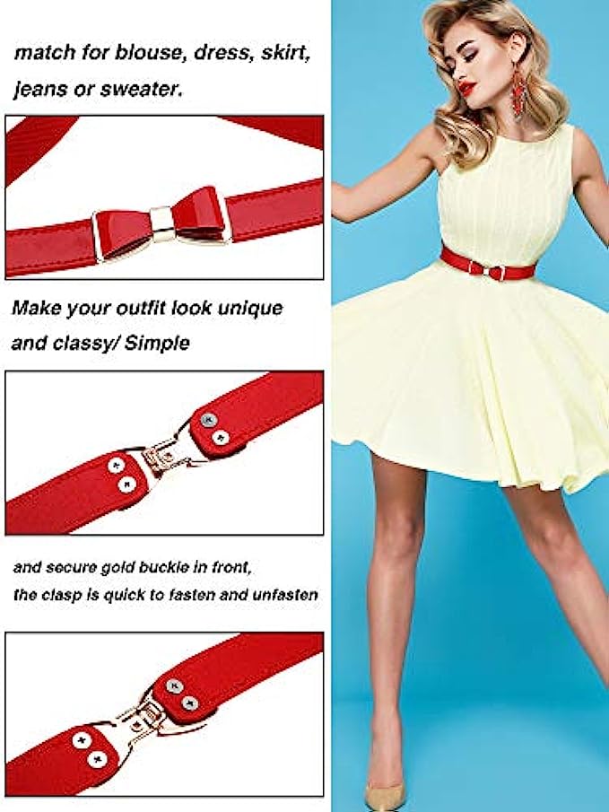 buckle closure Dry Cloth Clean Good elasticity: this belt is approx. 25.6 inches/ 65 cm long, it has good elasticity and can be stretched to about 31.5 inches/ 80 cm, suitable for most women and girls' waist Skinny belt: belt width is 0.8 inch/ 2 cm, and the decorative bow is 1.2 inches/ 3 cm wide, the skinny design makes the belt elegant and beautiful, which is a nice accessory for dress Easy to put on: its metal clasp allows you easily put it on and off, and the elastic band brings you comfortable experience; Material: faux leather, elastic band and metal buckle Fashion accessories: use it to change your waist line and improve your overall styling, the belt can go well with you blouse, dress, skirt, jeans or sweater, making you more attractive Various styles: coming with various styles skinny waist belt as pictures shown, can meet your needs in the daily life, it suitable for daily wearing or attending an important occasion