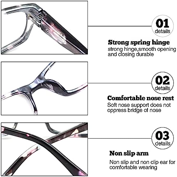 【Anti Glare UV Filter Lens】: Womens Blue light Reading Glasses with the polycarbonate material high-definition lens,Can Reduce Digital Eye Distortion, Block Blue Light, gaming and working under fluorescent lights with protection vision and glare reduction,no worry about eye fatigue, blurred vision.let. 【Fashion Design and Adjustable Spring Hinge 】:our product is made of durable TR90 material, lightweight and Flexible. The comfortable nose pad design will not make you feel uncomfortable to squeeze. A variety of Colorful to choose from, blue light ray reading glasses used in reade books/watching TV/mobile phone/ipad/computer games/work etc. 【Unisex Reading Glasses】:Square frames ,suitable for big, medium or small face.Total Width:(135mm/5.31inch) Temple Length:(130mm/5.12inch) Lens Width:(54mm/2.12inch) Lens Height:(28mm/1.10inch) Bridge Distance:(19mm/0.74inch. 【5 pairs Computer Readers for Women】:5 pack Included in a Set (Comes with a cloth bag and cleaning cloth), you can place a set of glasses where you need to read, which is convenient for daily use or which can be a exquisite gift sending to your families and friends. 【100% NO RISK WARRANTY AFTER SALE】:In order to creating greating shopping experience for our customers.Customers can return the goods for any reason and get a refund. You have no risk of buying.