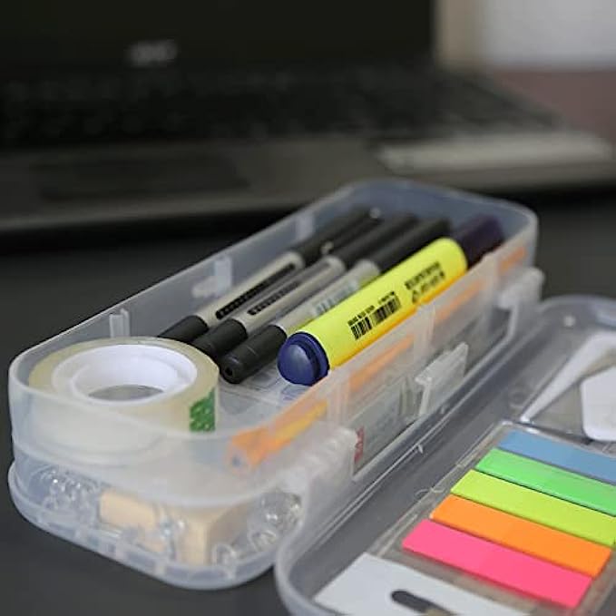 ALL IN ONE OFFICE KIT: you will find all the common office supplies from this little box, includs Binder Clips*12, Sharpener*1, Paper Clip*80, Stapler*1, Staples*1000, Rubber Band*12, Eraser*1, Clear Push Pin*18, Letter Opener*1, Page Marker*5, Steel Ruler*1, Pencil*2, Highlighter*1, Black Pens*3, Steel Scissor*1, Clear Tape*1,Clear Pencil Box* 1
