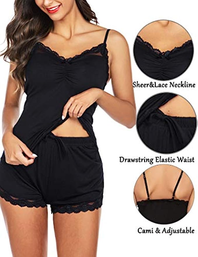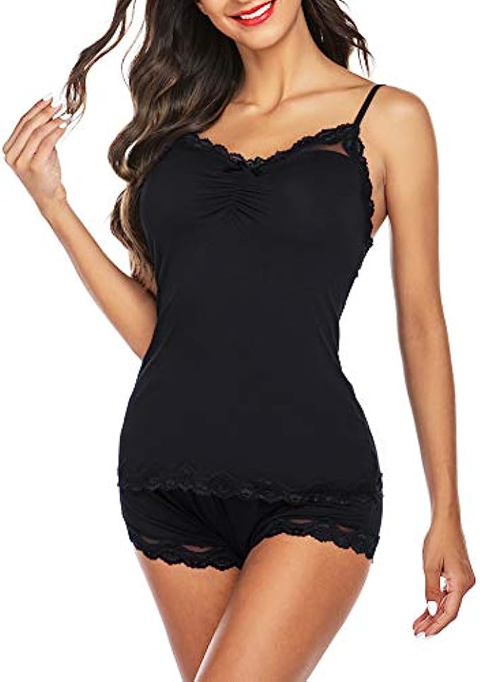 95% Polyester, 5% Spandex Imported Pull On closure Hand Wash Only Eco-friendly fabric: 95% Polyester, 5% Spandex. This women short pajama set is made up of slim-fit cami and easy-fit pants. It is soft and comfortable for your lounge time. 2 piece PJs set with a good elastic camisole & sexy shorts. Sleep top: sexy sheer and lace neckline with a bow and adjustable spaghetti straps.Sleep bottom: special shorts hem with sheer and lace design, elastic waistband with bow decoration in the middle of the front. Its casual style makes it not awkward even when guests visit. Take it as: pajamas sent for women, camisole and shorts, women's pajama shorts set, shorts pj sets for women, soft sexy pajamas for women, short sleepwear set for women, cami and shorts sleepwear sets, women's pajama sets sexy, pj sets for women shorts, cami sleep set. Simply relax in a lightweight pajama and have a good night.