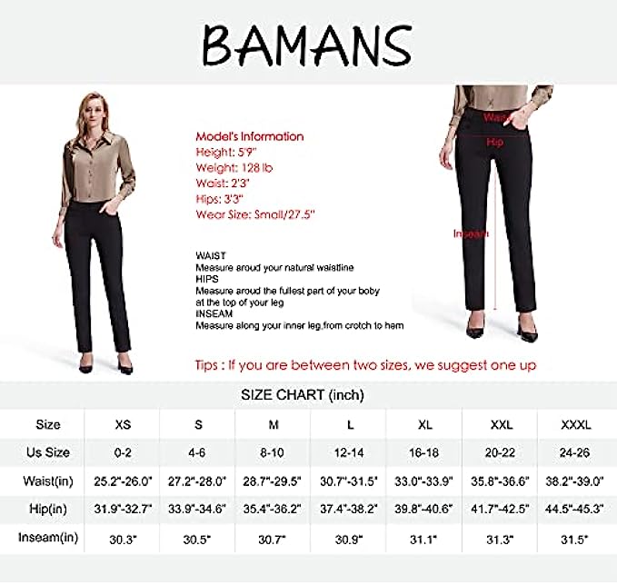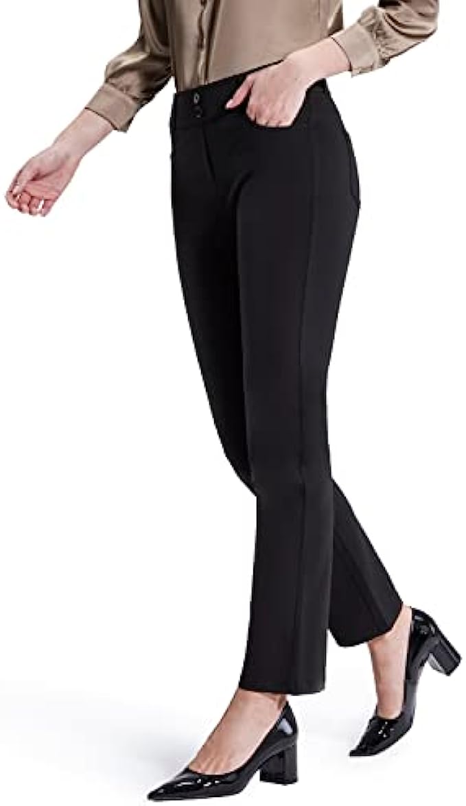 87% Polyester, 13% Spandex Imported Pull On closure Pull-on womens pants, no zippers, tummmy control for support. Easy to put on and won't fall off when you bend or squat. Unique style: stretchy waistband, false front, light-tight, wrinkle-resistant. Two decorative buttons at waist make the pants more fashionable. Straight leg design to show your streamlined appearance. The relaxed fit pants are superior comfortable and flatter many body types and shapes. Functional pockets:2 front pockets and 2 patch pockets at the back, are designed to provide enough storage to put some essentials when you go out or work. Solid black dress pants for womens can be well matched with many styles of suits to meet your needs. Appropriate for most occasions.