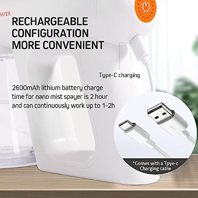 【???????????? ?????????????】The rechargeable USB cable is universal along with package(Not included 5V adapter), you do not need to exchange new batteries, 2600mAh lithium battery,fully charge time for nano mist spayer is 2 hour and can continuously work up to 1-2h.