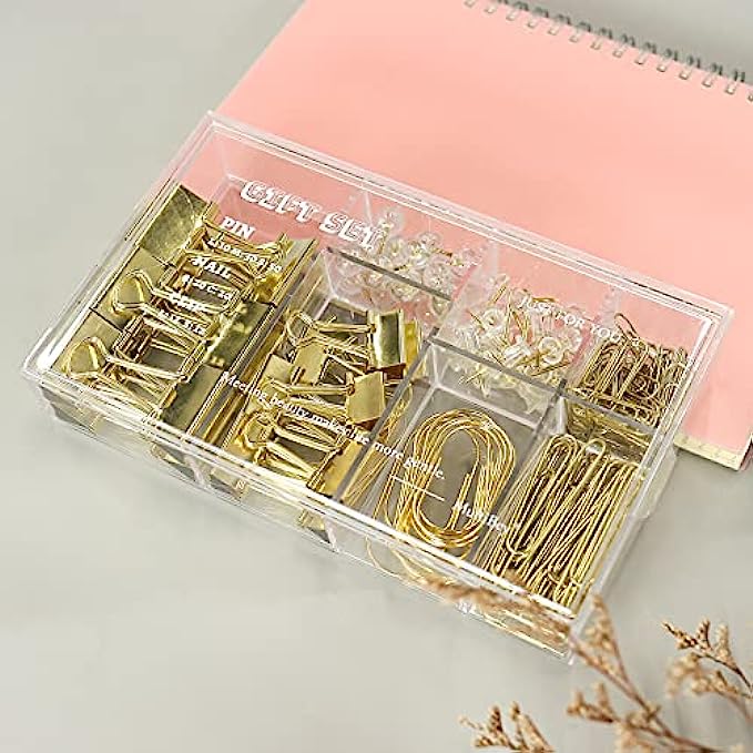 Gold Paper Clips Binder Clips, 154 PCS Luxury Gold Office Supplies Gift Set with Jumbo Paper Clips, Large Small Paper Clamps Binder Clips Clear Push Pins Office School Desk Organizer (Gold)