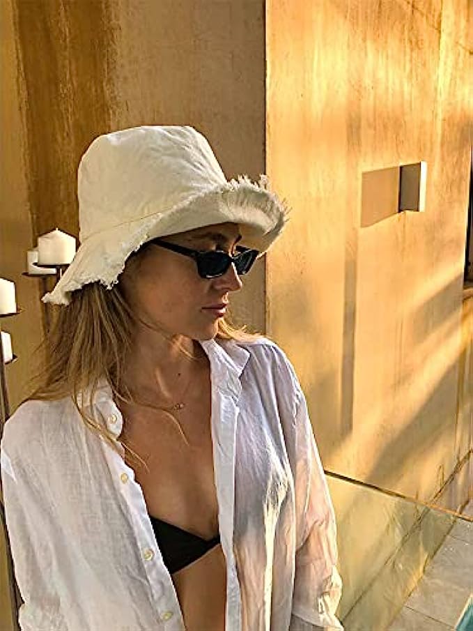 • Accessorize your casual looks with the classic cotton bucket hat. Created in a beige tone with channel stitching along the frayed brim, the hat pairs perfectly with jeans and a cotton tee for a relaxed, casual aesthetic