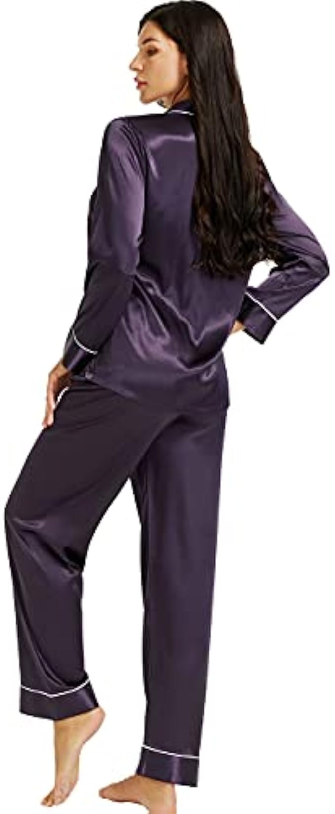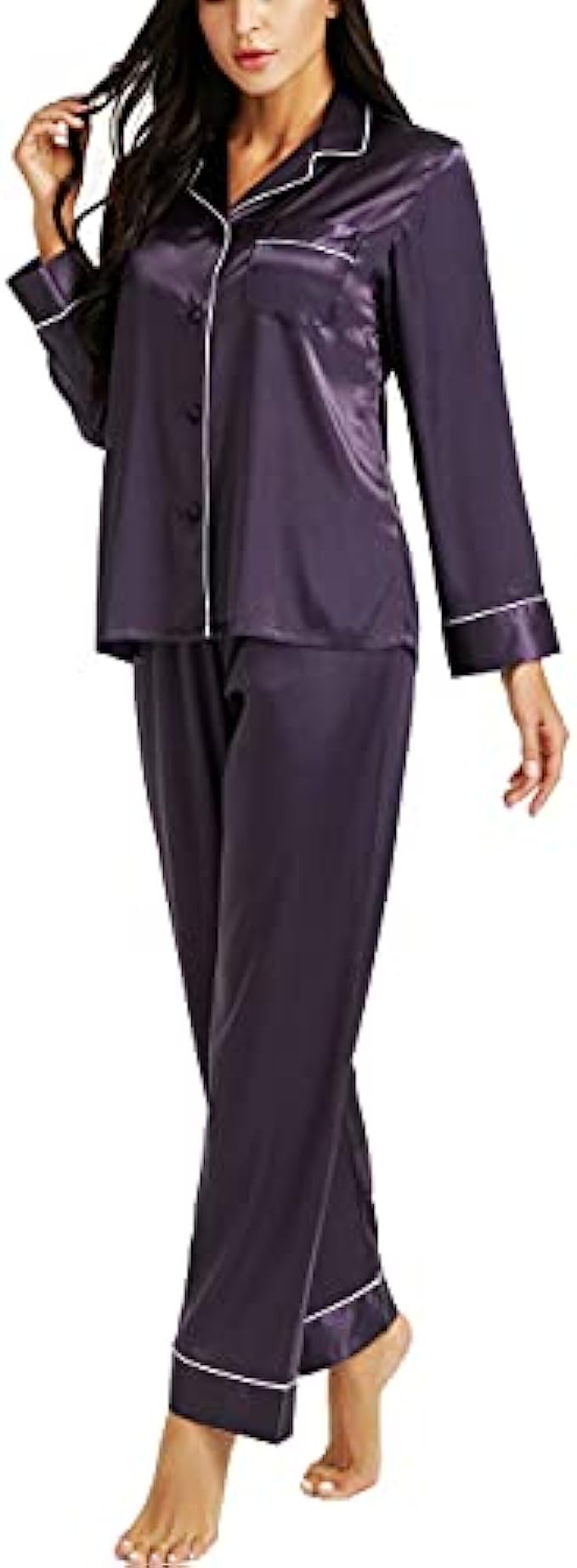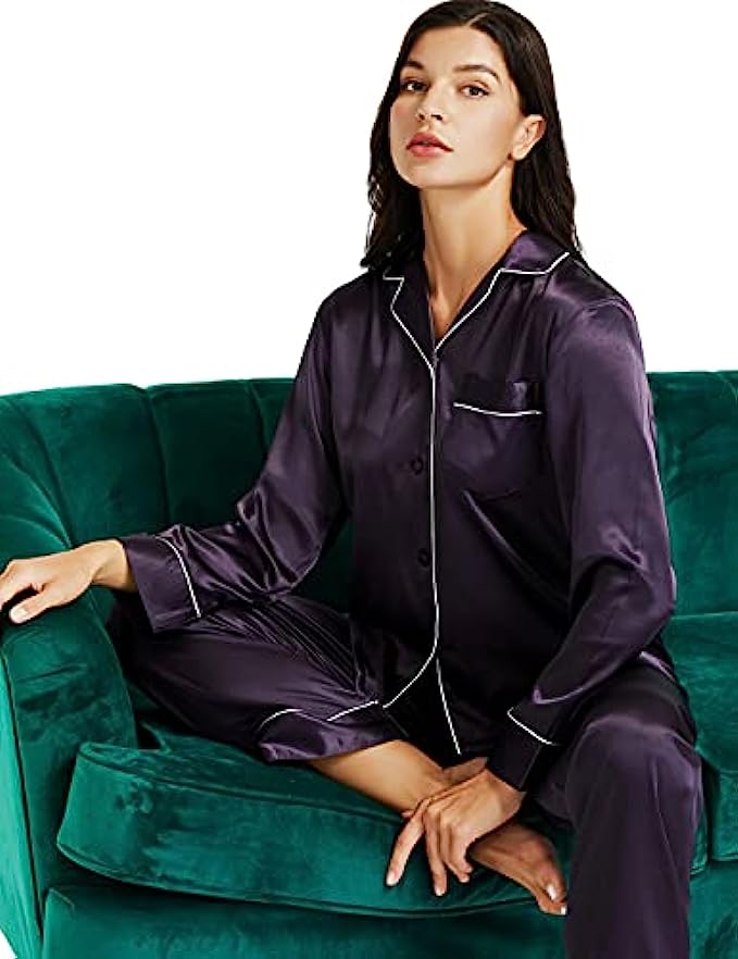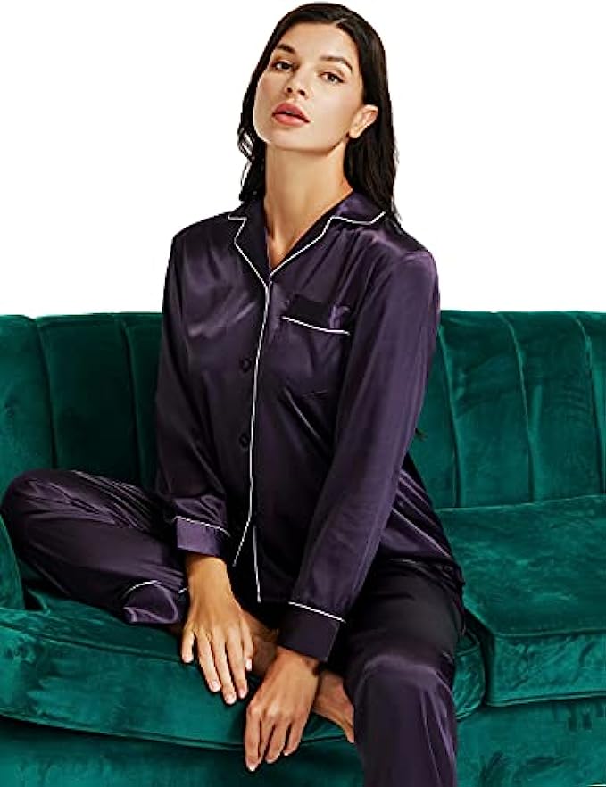 • Design --- Two-Piece comfort sleepwear pajama set,Women's Long Sleeve Silk Satin Pajamas Set,Button-down,Long sleeve,one chest pocket on the top ,The Pants of the silk satin pajamas has Elastic Waist With Drawstring , Comfortable and Relaxing Fit.