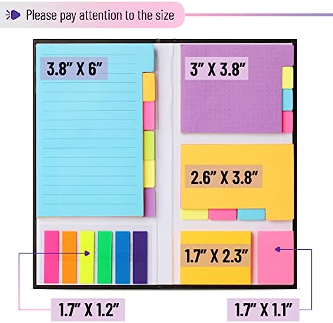 Each sticky notes set includes 60 Ruled (3.8x6’’), 40 Dotted Notes (3x3.8’’), 40 Blank (2.6x3.5’’), 60 Orange and Pink, 150 Neon Color Index Tabs, 410 Total Tab Divider Notes