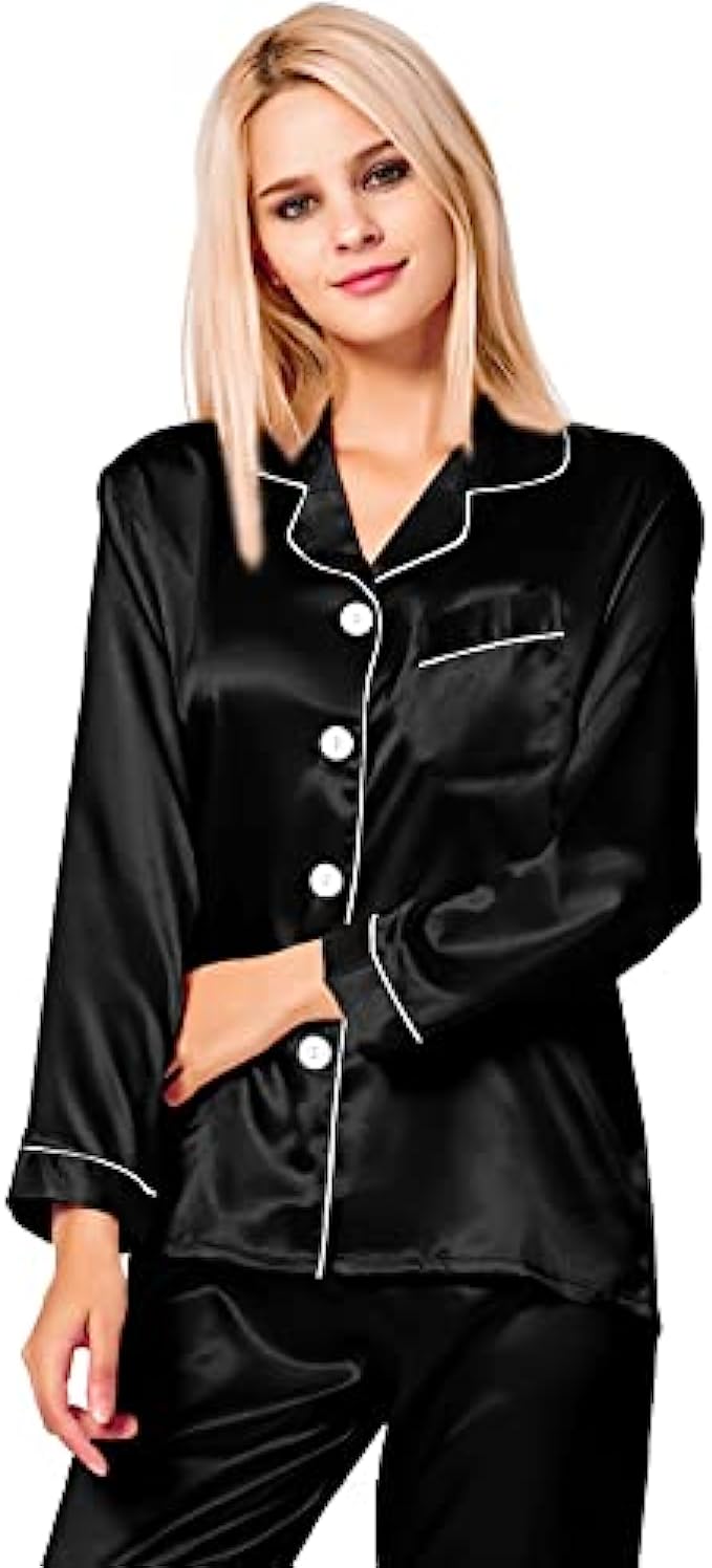 Button closure Machine Wash Materials: This lightweight pajama set is made of lightweigh silk satin, soft,breathable and skin-friendly, help you have a sound sleep. Features: The relaxed fit two-piece comfortable sleepwear pajama set features the silkiest pant with elastic waist and matches a silky-smooth long-sleeve V-neck top with a chest pocket, notch collar and the button-front top hits at hips. The sleepwear set are soft and elegant, to giving you a lazy sleep. Occasion: Women's Long Sleeve Silk Satin Pajamas Set, which is suitable for daily wearing and easy to match. Comfortable and suitable for lounging and sleeping, pajama party, girls day, bridal sleepwear, indoor, living room, bedroom, hotel, vacation, travel, and daily sleepwear. Gift: Women's silk pajamas for women is made of high quality imitation silk fabric, it is soft and natural shiny. Great Choice For your Wife, Girlfriend, Mother, Sister and Doughter as a Birthday gift and Great Present for New Year, Valentine's Day, Christmas Day, Bridal Party Gifts, Honeymoon Vacation or other Festivals or Anniversaries. Washing Tips: Machine Washable, Hand Washed Suggestion.