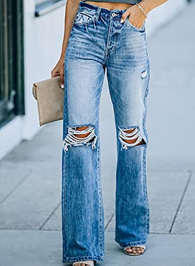 Sidefeel Women Mid Rise Distressed Flare Wide Leg Jeans Ripped Hole Denim Pants
