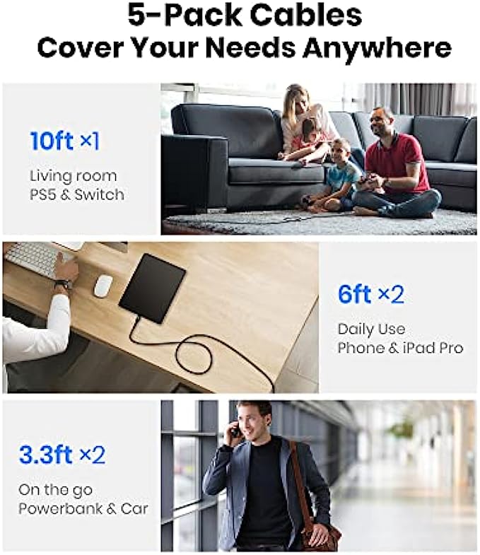 • ✅【One package, 5 Fast Charging Cables】 The real one-stop cable solution, with two 3.3fts, two 6fts and one 10ft, you’ll wonder why you bother to buy any extra cables. Share them with your family or friends or simply put them anywhere you want to stay powered. They’ve got your needs all covered.