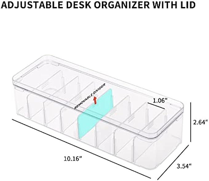 【DIMENSION】: The overall dimension ( L x W x D): 10.1 x 3.5 x 2.6 Inches ( 25.8 x 9 x 6.7 cm); Compartment ( L x W x D): 3.3 x 1 x 2 Inches ( 8.6 x 2.7 x 5.3 cm). Package includes 2pcs of clear plastic storage boxes with lids and 20pcs of wire ties.