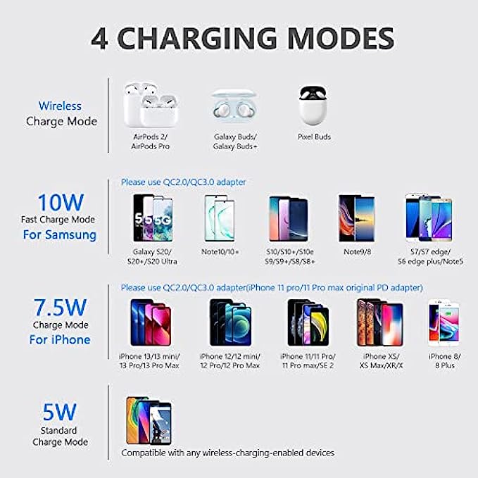▶[TWO PACK DESIGN]: Comes with two wireless charging pads in the package. You can use one to charge your AirPods and the other one to charge your phone, or use one at home and one at office. Great combination for a family or one with two mobile phones and AirPods. ▶[3 CHARGING MODES AVAILABLE FOR DIFFERENT PHONES]: 7.5W charging mode is compatible with iPhone 13/13 Pro/13 Mini/13 Pro Max/SE 2022/12/SE 2020/11/XS/XR/X/8;10W charging mode is compatible with S22/S22 Ultra/S21/S20/Note 10/10 Plus/S10/S10 Plus/S10E/Note9/S9/S8 and so on;5W charging mode works on any wireless-charging-enabled devices like Google Pixel 3/3XL/4XL and other wireless-charging-enabled phones. Note:Adapter is Not Included,QC 2.0/3.0 adapter will be highly recommended. ▶[UNIQUE DESIGN PERFECT FOR AIRPODS]: It is compatible with AirPods (with wireless charging case) and AirPods Pro. The size of the AirPods fits perfectly into the charging area of the wireless charging pad, perfect wireless charging companion for AirPods, easier to find the “Sweet Spot”. Also, both top and bottom have a rubber ring, will keep your AirPods in place and prevent slippage ▶[SAFER AND EASIER TO USE]: Exclusive Multifunctional Intelligent Protect Technology provides temperature control, surge protection, short-circuit prevention. Besides that, this wireless chargers is made of ABS Material which is fire-resistant, and has a UL Certificate, you can purchase it at assurance. Double guarantee and dual safety provide you safety experience.To get better experience, we would like you to take off the phone case and use the adapters recommended (NOT INCLUDED) ▶[PACKAGE AND SERVICE]: You will get 2 x wireless charging pad, 2 x 3. 3ft USB Type C Cable, 1x User Manual and reliable 12-hour response service. At Yootech, zero risk purchase is for every customer's smiles.